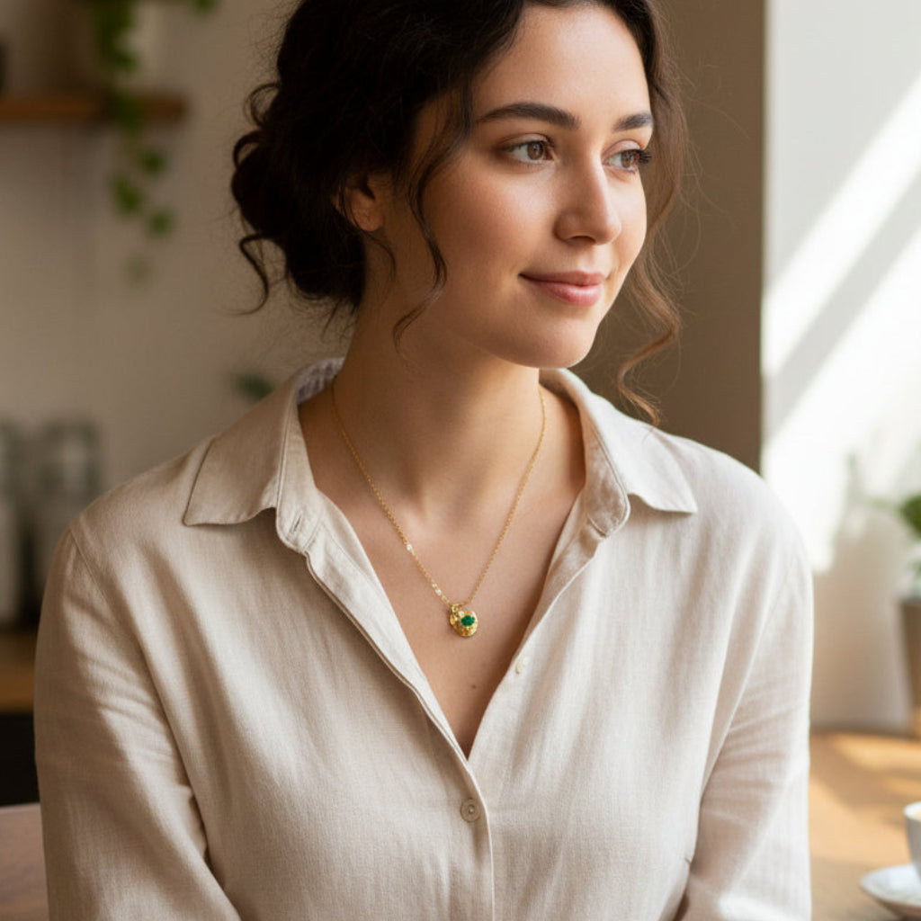 Zdjęcie przedstawia przykład końcowego efektu wykonanej biżuterii. Tworząc biżuterię stosuję różne techniki formowania i odlewania metalu. W wyniku tych procesów każdy element jest nieco inny pod względem kształtu, rozmiaru, struktury lub koloru. Naturalne kamienie i rośliny również różnią się od siebie w przyrodzie. Staram się, aby biżuteria była jak najbardziej zbliżona wyglądem do prezentowanej na zdjęciu.